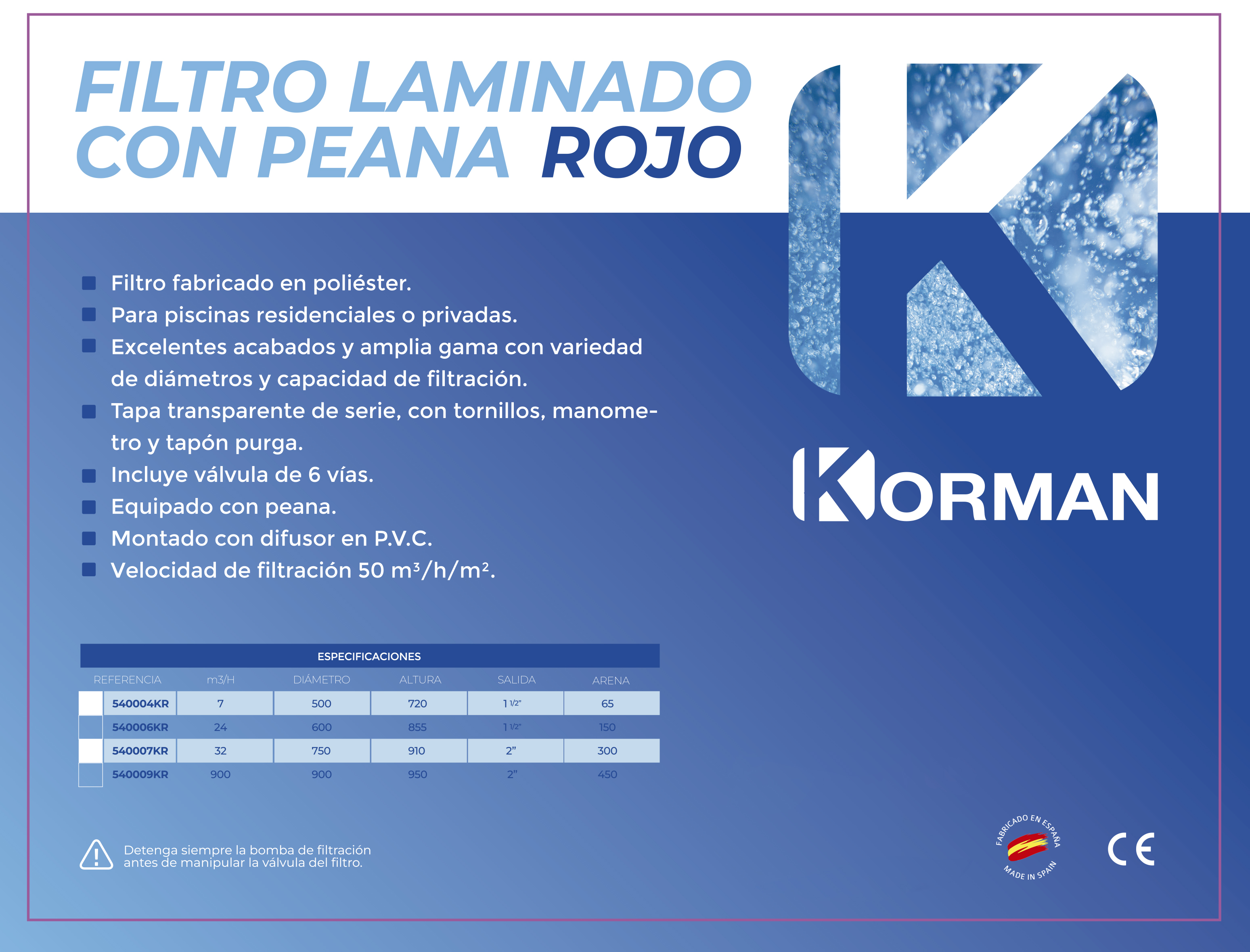Filtro laminado con peana rojo korman fabricado en poliéster. Para piscinas residenciales o privadas con excelentes acabados y amplia gama con variedad de diámetros y capacidad de filtración.